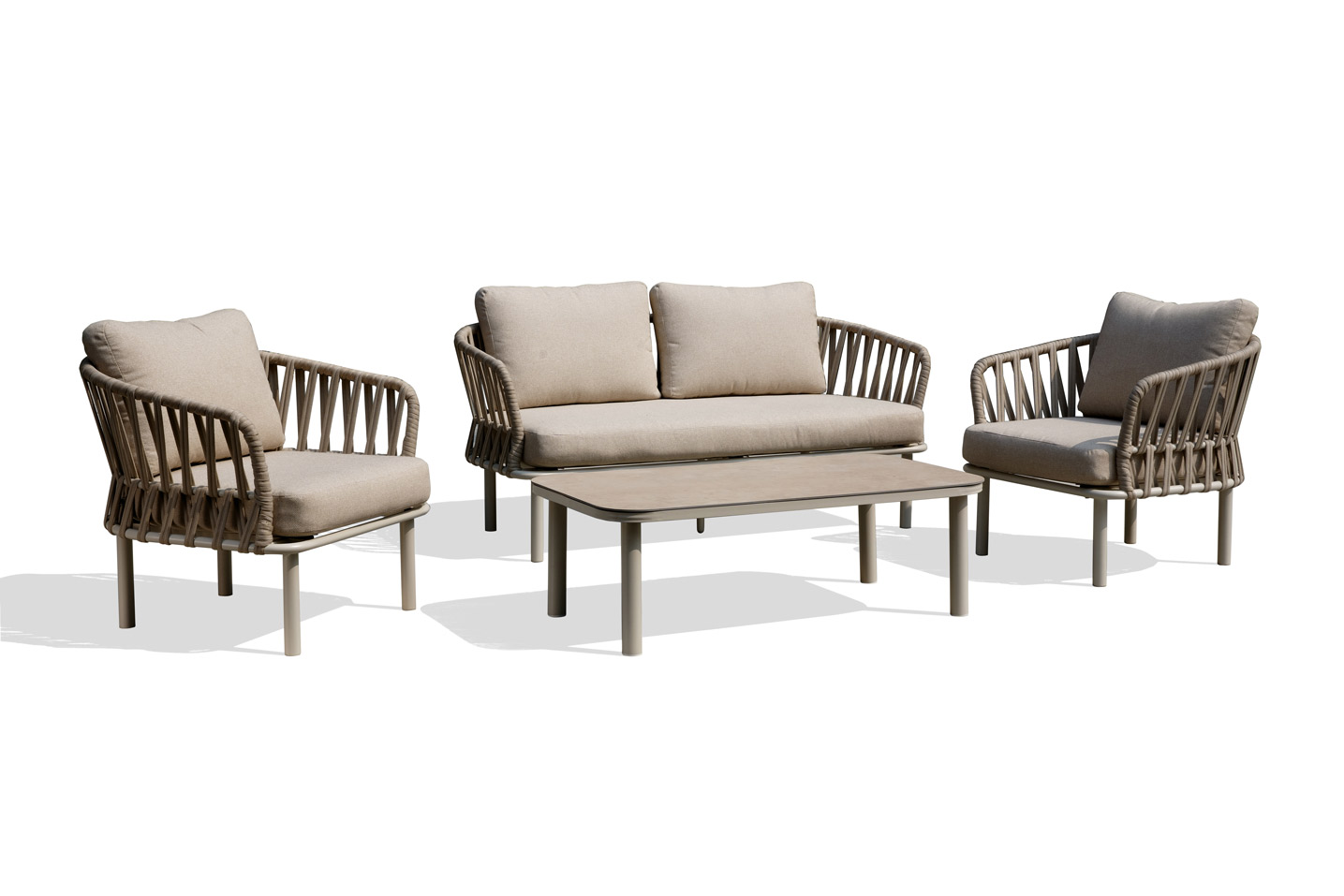 A refined 4-piece outdoor lounge set featuring twin-groove handwoven webbing across the armrests and backrests. Paired with a smooth curved aluminum frame and detachable cylindrical legs, it offers an elegant look with space-saving packaging — designed for B2B flexibility.