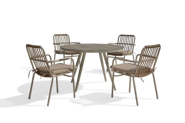 This outdoor dining set features hand-woven rattan craftsmanship combined with a cream white aluminum frame and a printed stone-look tempered glass tabletop. The warm tones of reddish-brown rope and beige cushions complement the frame beautifully, creating a natural and inviting aesthetic. Perfect for gardens, patios, terraces, and a variety of outdoor living spaces.